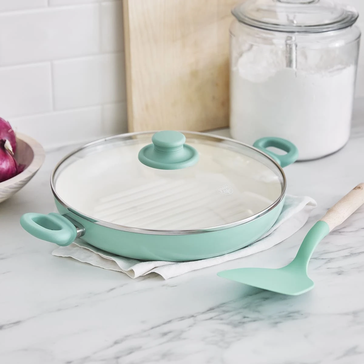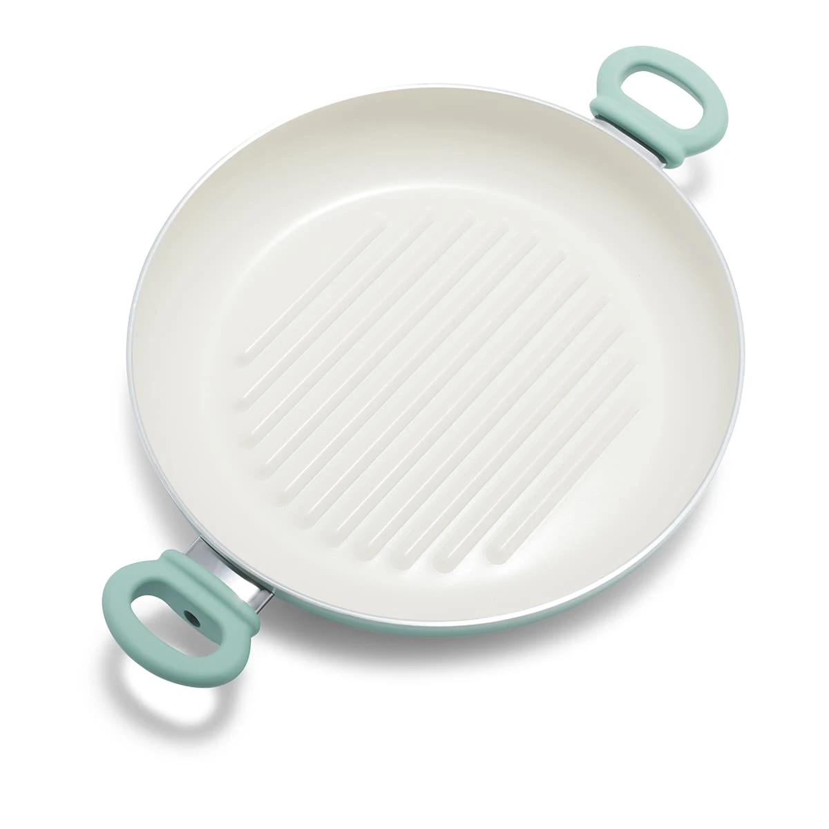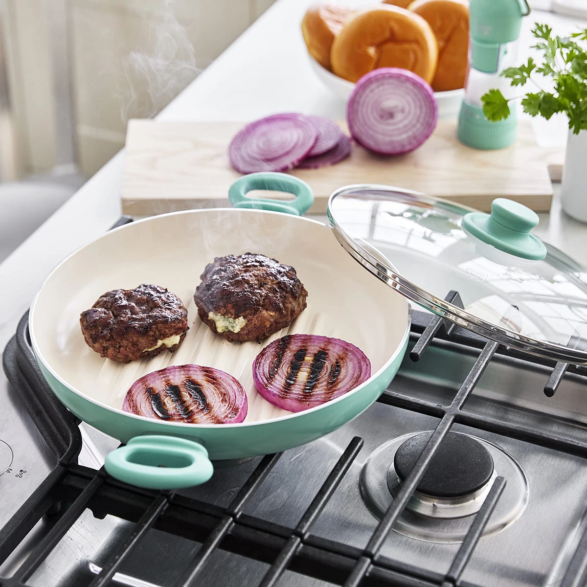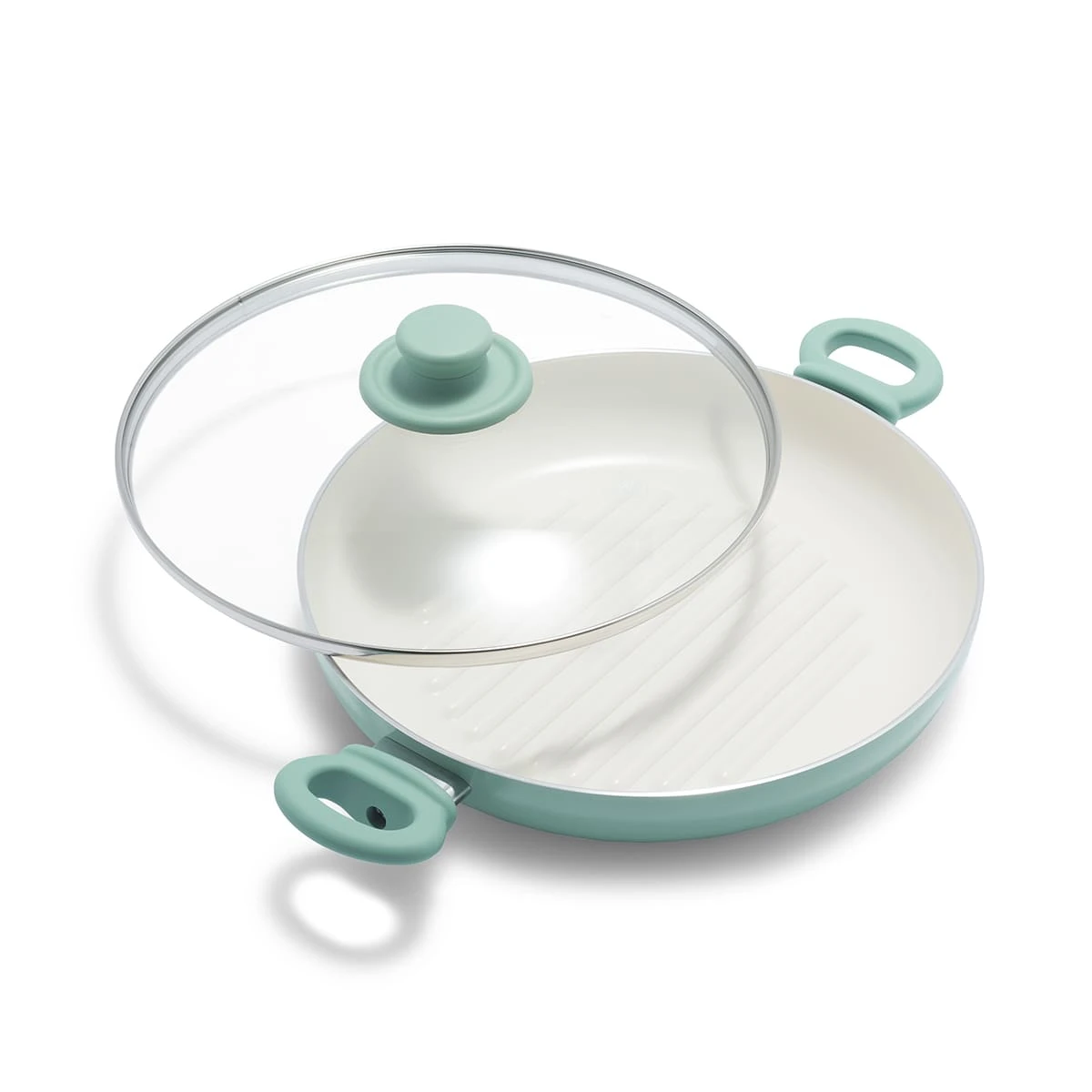 The Soft Grip grill pan is your go-to grill for any weather! This grill pan is specially designed for maximum performance. Featuring high grill lines that sear in flavour while letting fat and grease drain away, this pan comes with a steam lid that helps cook your food up to 30% faster. Designed for effortless performance and cleanup, this pan features our ceramic non-stick coating, which is free of PFAS chemicals. The extra-large design delivers plenty of room for your meal, plus it’s lightweight and compact enough for easy storage.