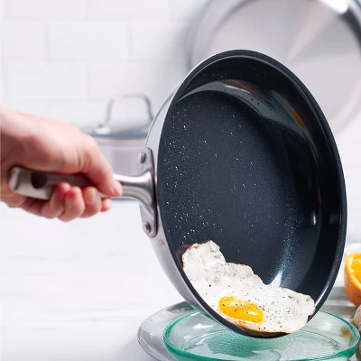 Exclusively for Target, GreenPan’s Greenwich collection is equipped with triple-layer construction (two stainless steel layers with a full aluminum core) for even heating and professional cooking results right in your home. Featuring a healthy, chip-resistant, metal utensil safe, diamond-reinforced ceramic nonstick coating, this lidded 12” frypan covers all your bases—from sautés to bakes and beyond.