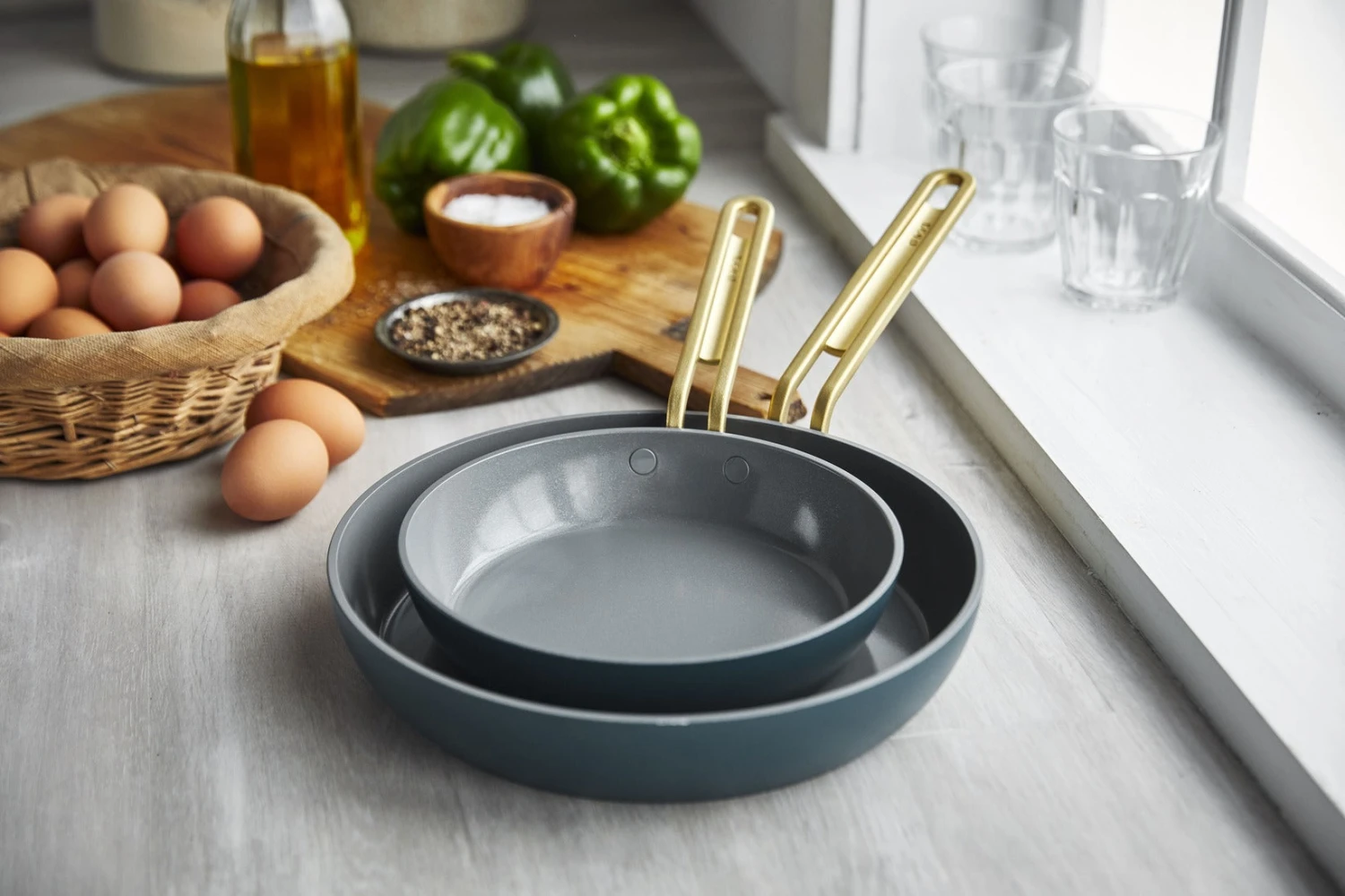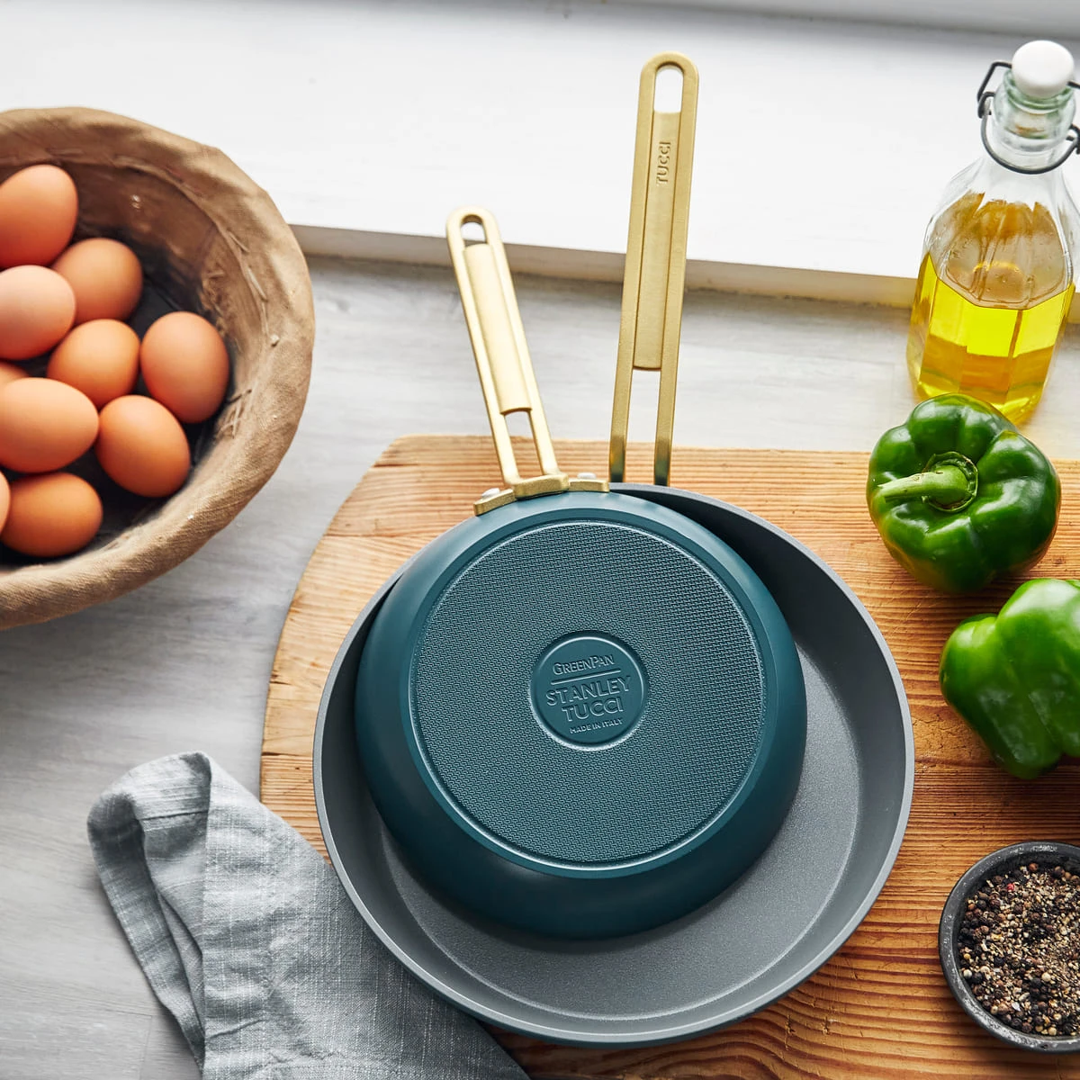 Stanley Tucci partnered with GreenPan to create a cookware collection from the ground up, focusing on innovations that take cooking to the next level. Packed with cutting-edge details, this frying pan set brings high-tech cooking to any kitchen. Made in Italy, these pans feature heavy-gauge 5mm bodies with a cutting-edge Plasma Tech treatment that complements our Thermolon™ ceramic non-stick coating for remarkable PFAS-free performance.