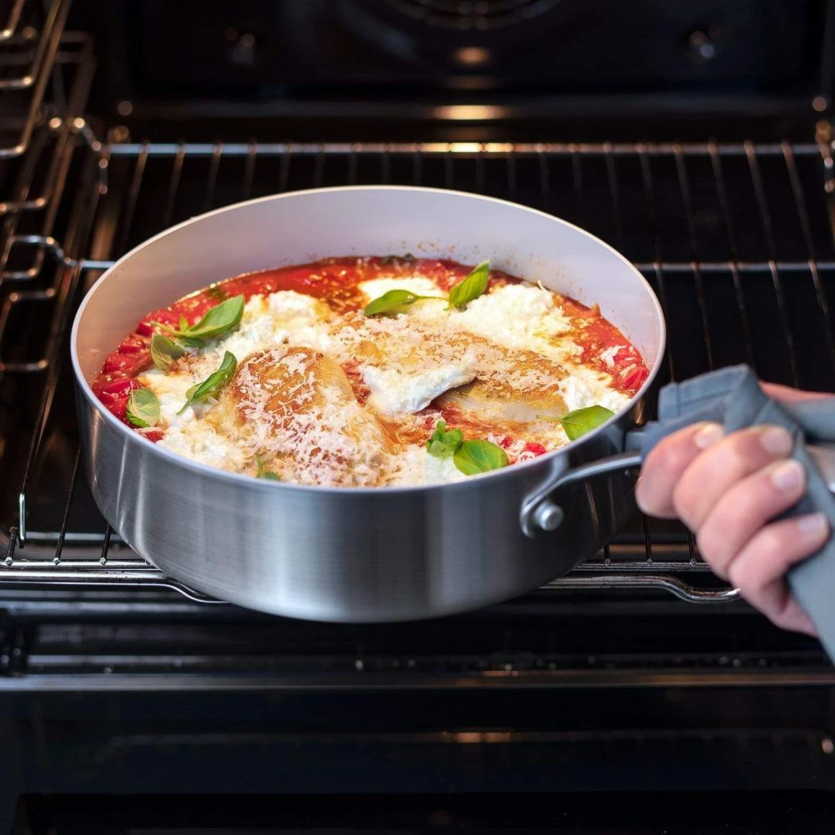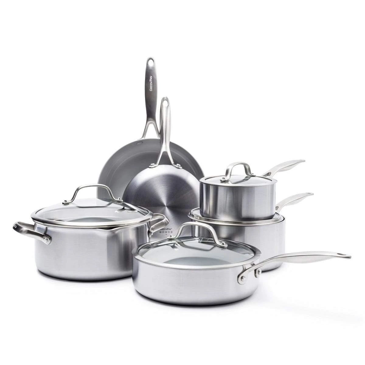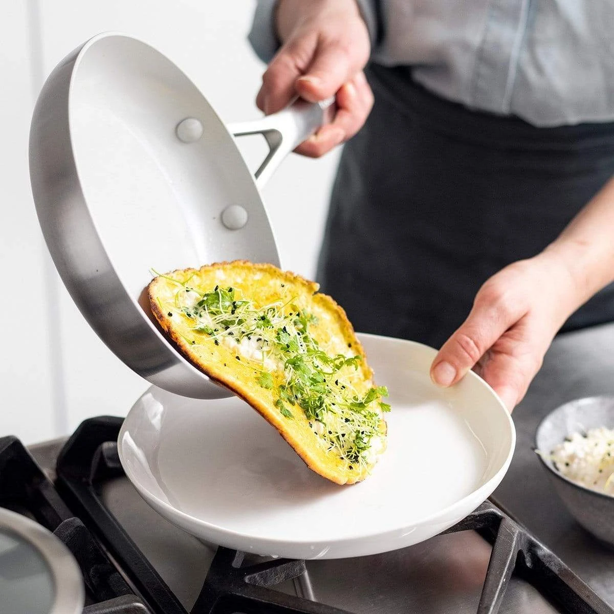 For extra durability and endless stovetop possibilities, look no further than this all-inclusive set. Equipped with 10pc, it’s here to cover all your bases—from sautés to bakes, fluffy scrambled eggs to fall-apart tender salmon. Crafted from ultra-tough, multilayer stainless steel and finished with GreenPan’s signature healthy ceramic non-stick coating, each piece is safe for all cooking surfaces (ovens, too). Look a little closer, and you’ll find more smart details, like two pour spouts and a built-in strainer on our stockpot lid for no-sweat prep.